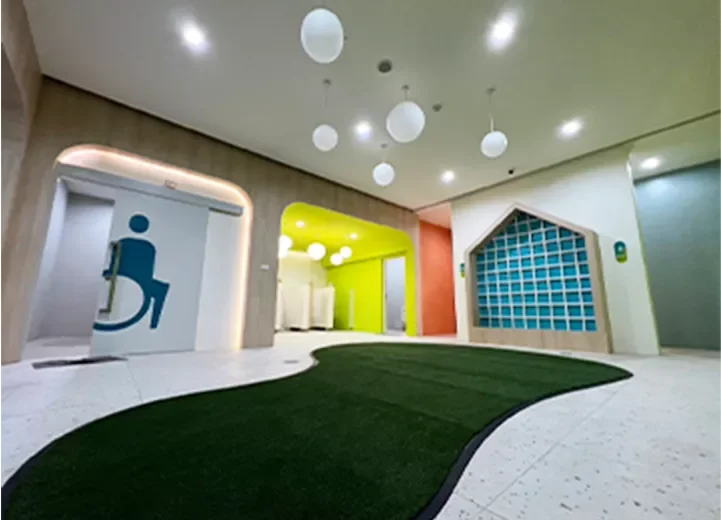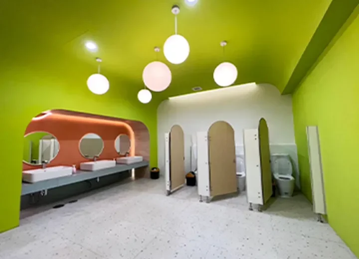 The bathroom floor is covered with non-slip material. Various equipment is installed at a level suitable for children.