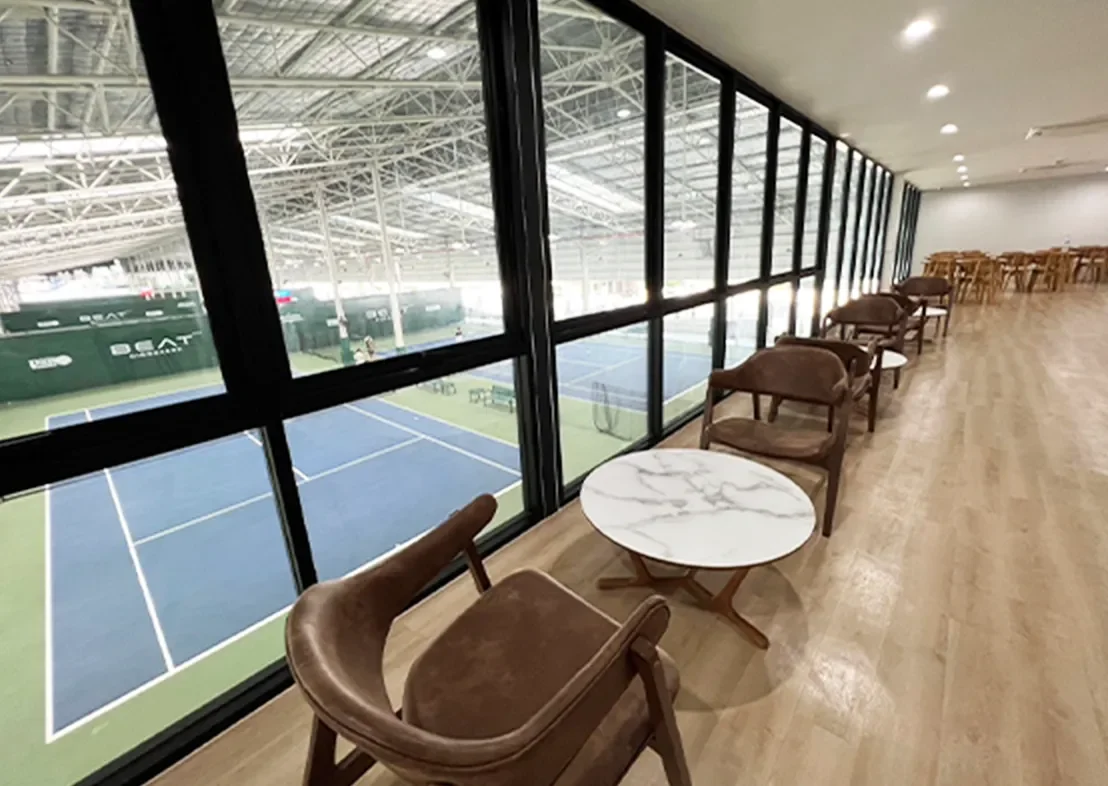 The glass lounge on the 2nd floor at BEAT Discovery is designed to allow parents to relax comfortably and unwind while their children are having fun playing sports in a safe and comfortable place.